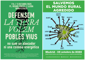 Toni Jorge/septiembre 25, 2025Para el domingo 5 de octubre se han organizado dos convocatorias de manifestación, una en Madrid convocada por más de 400 plataformas y otra en Lleida convocada por colectivos vinculados a la agroecología, a la oposición al despliegue indiscriminado de renovables y plantas de biometano.