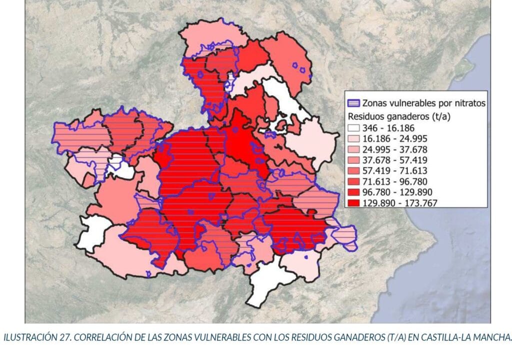Según las Encuestas Ganaderas del Ministerio de Agricultura, desde 2010 hasta 2021 se produjo un 40 % de incremento en las cabezas de porcino en CLM hasta llegar a 1,87 millones. (2). Esto provocó que a nivel estatal no se cumplieran los límites de emisiones de amoniaco (3). A finales de 2024 existían en CLM 1065 macrogranjas y un 46,4% de las masas de agua subterránea contaminadas por nitratos, la mayor tasa de España, por la utilización excesiva de fertilizantes y purines, que han dejado a decenas de pueblos con agua del grifo contaminada (9). En 2024 el Tribunal de Justicia europeo condenó a España por no tomar medidas contra la contaminación de las aguas subterráneas por nitratos producidas por las malas prácticas de la agroindustria, incluida la ganadería industrial.