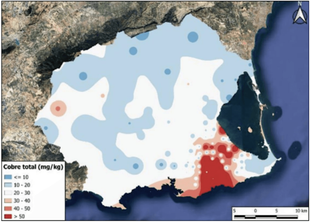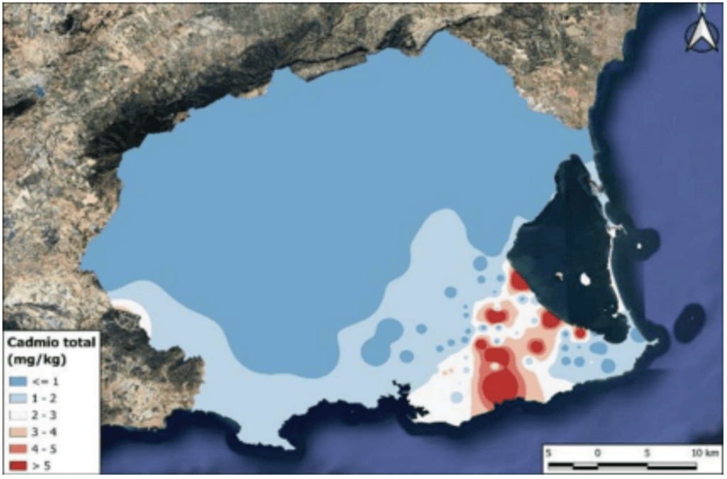 Denunciamos la inacción administrativa ante unos mapas oficiales de isoconcentraciones de plomo (Pb), cadmio (Cd), zinc (Zn) y cobre (Cu) que muestran patrones espaciales coherentes de contaminación en suelos agrícolas del Campo de Cartagena. No hablamos de conjeturas: hablamos de cartografía elaborada para la Administración, con zonas claramente identificadas como hotspots y gradientes compatibles con aportes históricos de origen minero-metalúrgico.