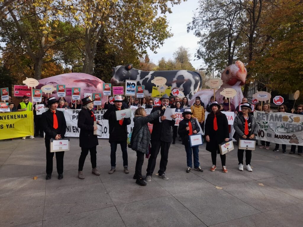 Todas estas plataformas decidieron aportar a la semana europea un acto el sábado 29 de Noviembre consistente en una Concentración–performance contra la ganadería industrial que se efectuó en Madrid en la Cuesta Moyano. Dicha performance se hizo con el acertado título “ La subasta de nuestros pueblos” por el hecho de que, las diferentes administraciones, con su pasividad o con su actividad están propiciando un modelo que además de contaminante, expolia los recursos rurales e induce a la despoblación.