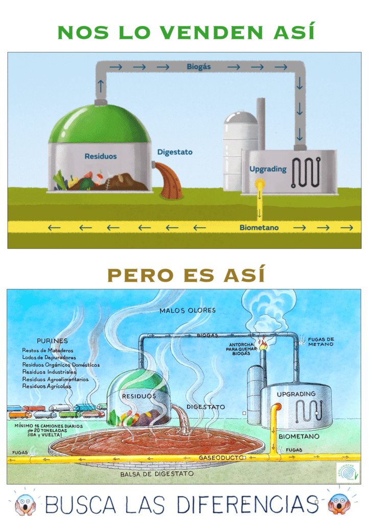 Sabemos que parte de la organización piensa que  tenemos el deber de gestionar mejor la ingente cantidad de bioresíduos que se almacenan, queman, abandonan, no se tratan y se vierten ilegalmente generando graves impactos ambientales. Se reparten así las responsabilidades en toda la población , como si nos dejaran elegir el tipo de sistema agroalimentario que queremos y como si tuviéramos la culpa de que el sistema agroganadero vigente produzca un 70 por ciento de los residuos totales (nosotros no tenemos ninguna responsabilidad, no somos los actores que toman las decisiones ). Si como organización seguimos sosteniendo que con las plantas de biogás van a desaparecer estos impactos y todo arreglado, seremos tan responsables como las grandes energéticas y las cárnicas. Nos parece el colmo de la ambigüedad definir la relación entre el biogás y la ganadería industrial como compleja, esto no es cierto, se trata de una relación muy sencilla, las plantas de biogás se han lanzado por la inmensa cantidad de residuos que genera esta y es la propia ganadería industrial la principal defensora del modelo de biogás que se está implantando. Para muestra un botón: Litera Meats impulsa 25 granjas porcinas de 864 UGM en el Bajo Aragón junto con 3 plantas de biogás para generar biogás a partir de los purines. El negocio antes era la ganadería industrial, y ahora es la ganadería industrial y el biometano. No es economía circular, es un círculo vicioso destructivo. Las plantas de biogás no van a reducir la contaminación de los bioresíduos, sino que van a aportar un problema adicional , los van a hacer valiosos y por lo tanto no se va a contemplar la reducción de los mismos. Se están frotando las manos con nuestra indefinición.