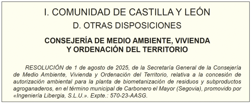 .Asistimos a un goteo constante de concesiones de licencia para la construcción de grandes plantas de biometano por parte de las comunidades autónomas de la llamada «España vaciada». Captura del BOCyL