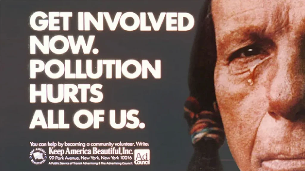 Una de las campañas de propaganda más memorables fue la de Iron-Eyes Cody (también conocido como Espera Oscar de Corti), quien no era indígena, pero interpretaba a uno en la televisión. Aquí lo vemos remando en su canoa. Si bien pasa junto a algunas plantas industriales, esperen hasta el final para descubrir al verdadero villano y el libro sobre 71 cosas que pueden hacer para detener la contaminación.