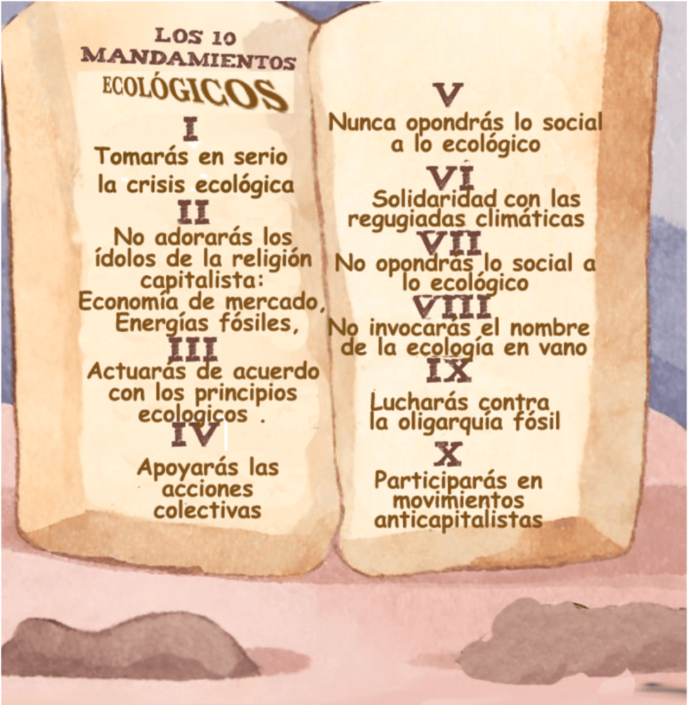 II. No adorarás los ídolos de la religión capitalista: Economía de mercado, Energías fósiles, crecimiento del PIB, Organización Mundial del Comercio, Fondo Monetario Internacional, competitividad, pago de la deuda, etc. Son falsos dioses, ávidos de sacrificios humanos, y responsables del calentamiento global.