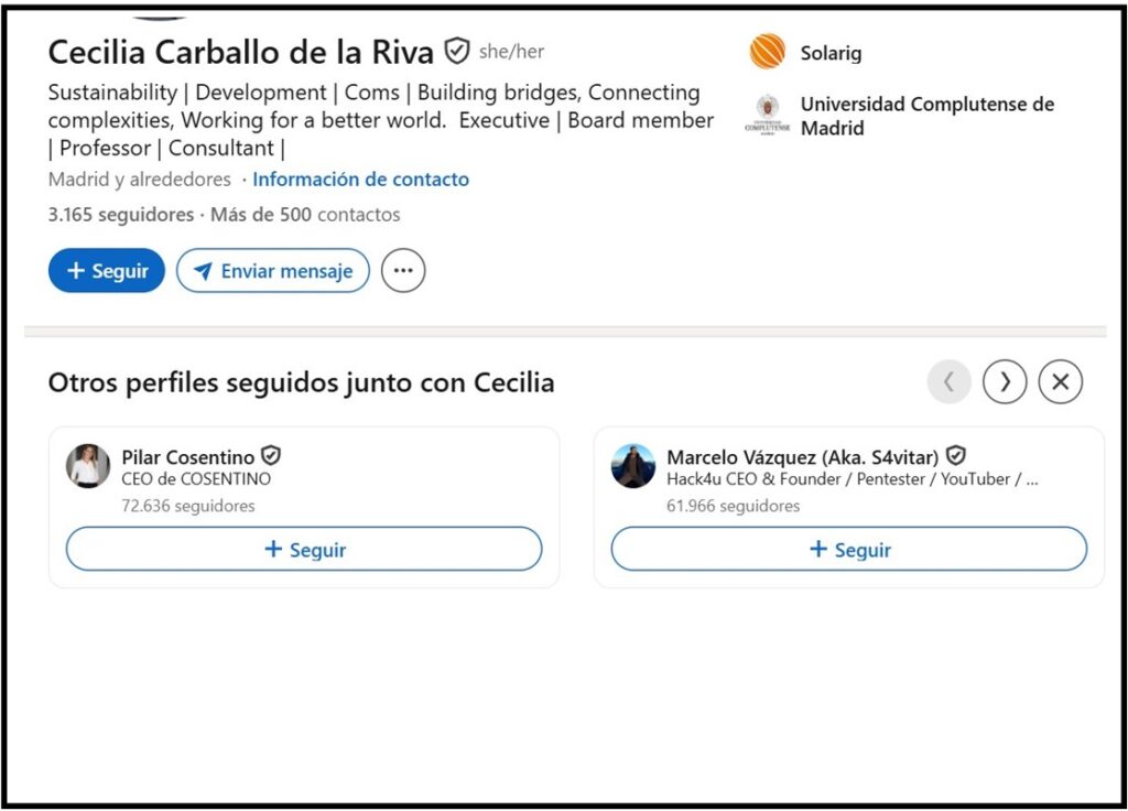Por si esto no fuera suficiente, y para alarmarnos todavía más, si vamos a su perfil de Linkedin, se define a si misma como titulada en ciencias políticas y con más de 30 años de experiencia en sostenibilidad y desarrollo para entidades públicas y aparecen multitud de administraciones y entidades privadas, entre ellas SOLARIG.
