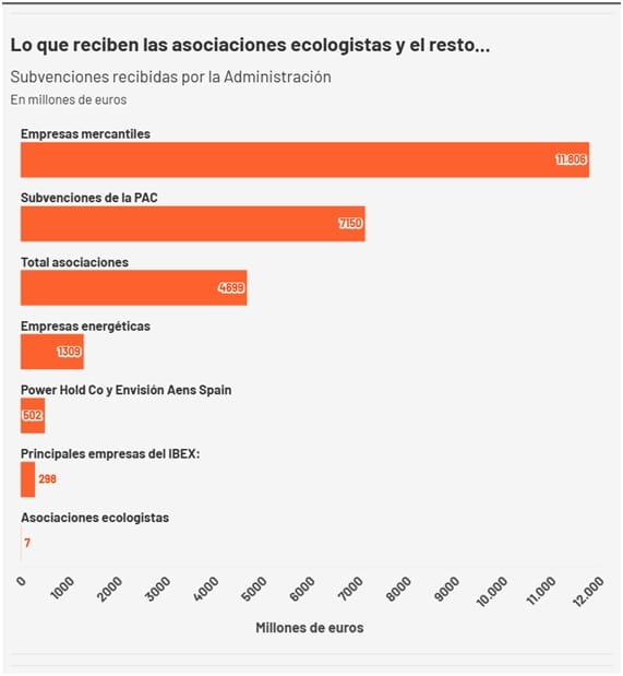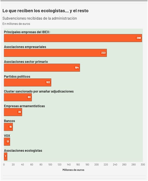 Puede parecer mucho. La realidad es que sólo un 0,05 % de las subvenciones superiores a 100,000 € concedidas por las administraciones, van a asociaciones ecologistas.