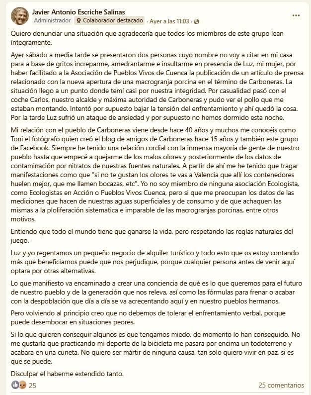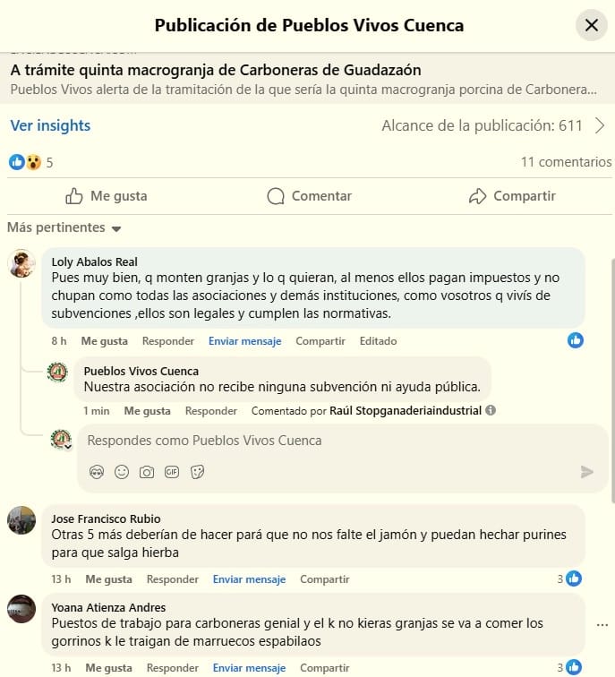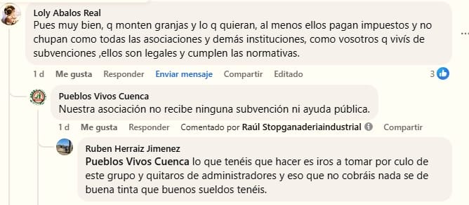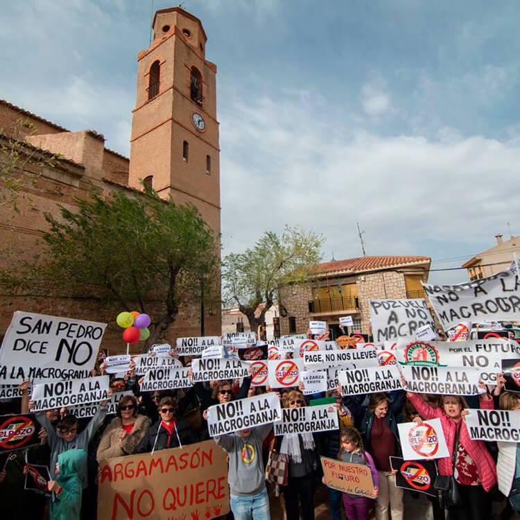 En Mira, uno de los vecinos y militante ecologista fue amenazado de muerte por el promotor de una granja al impedir de manera legal su construcción. En Cardenete los vecinos que se oponen a la macrogranja presente a 1,2 kms del núcleo urbano , no se atreven a levantar la voz ante el dominio del municipio que ejerce una familia local. En Carboneras, el caso más reciente, Pueblos Vivos expresó mediante una nota de prensa de bastante repercusión su oposición a la instalación de la quinta granja de cerdos ante el problema galopante de contaminación por nitratos, el excesivo censo ganadero ya existente, y las malas prácticas reiteradas en el uso de purines para el abonado.