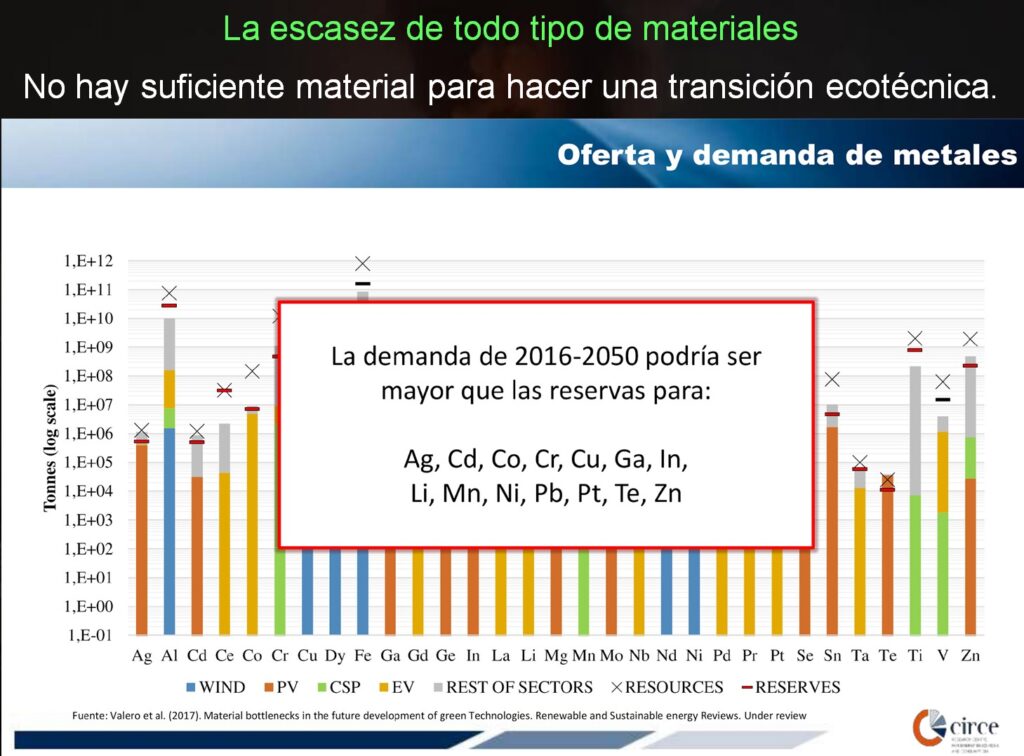 Precisamente porque nos solemos fijar en un detalle en lugar de en todo el cuadro, confiamos en la tecnología de las renovables sin darnos cuenta de dos detalles: por una parte que la minería de la que depende la extracción de sus materias primas no se puede realizar sin fósiles, y por otra de que las materias primas en que se asientan pueden agotarse sin poder satisfacer la demanda de ellas. La demanda desde 2016 a 2050 de Ag,Cd,Co, Cr,Cu,Ga,In,Li,Mn,Ni,Pb,Pt sería mayor que las reservas existentes, y además el mercado no podría abastecerse a la velocidad necesaria.